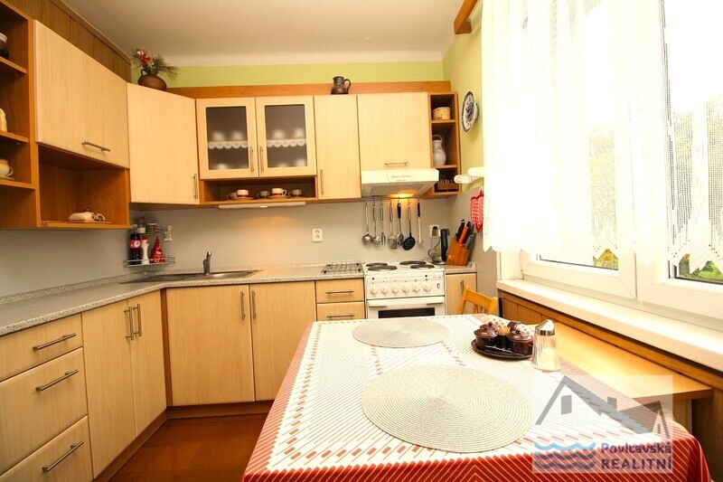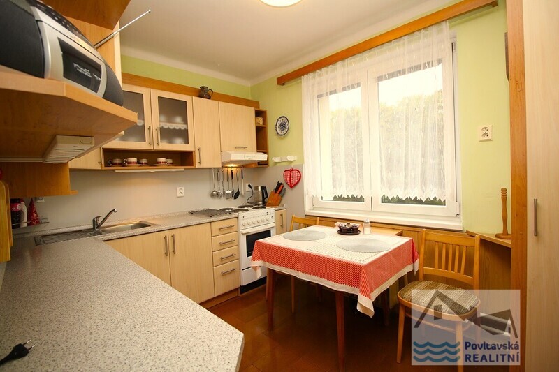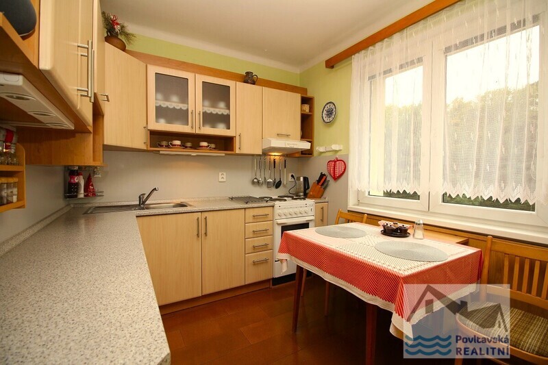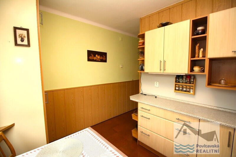 kuchyňskou linkou včetně spotřebičů a dostatkem úložného prostoru.